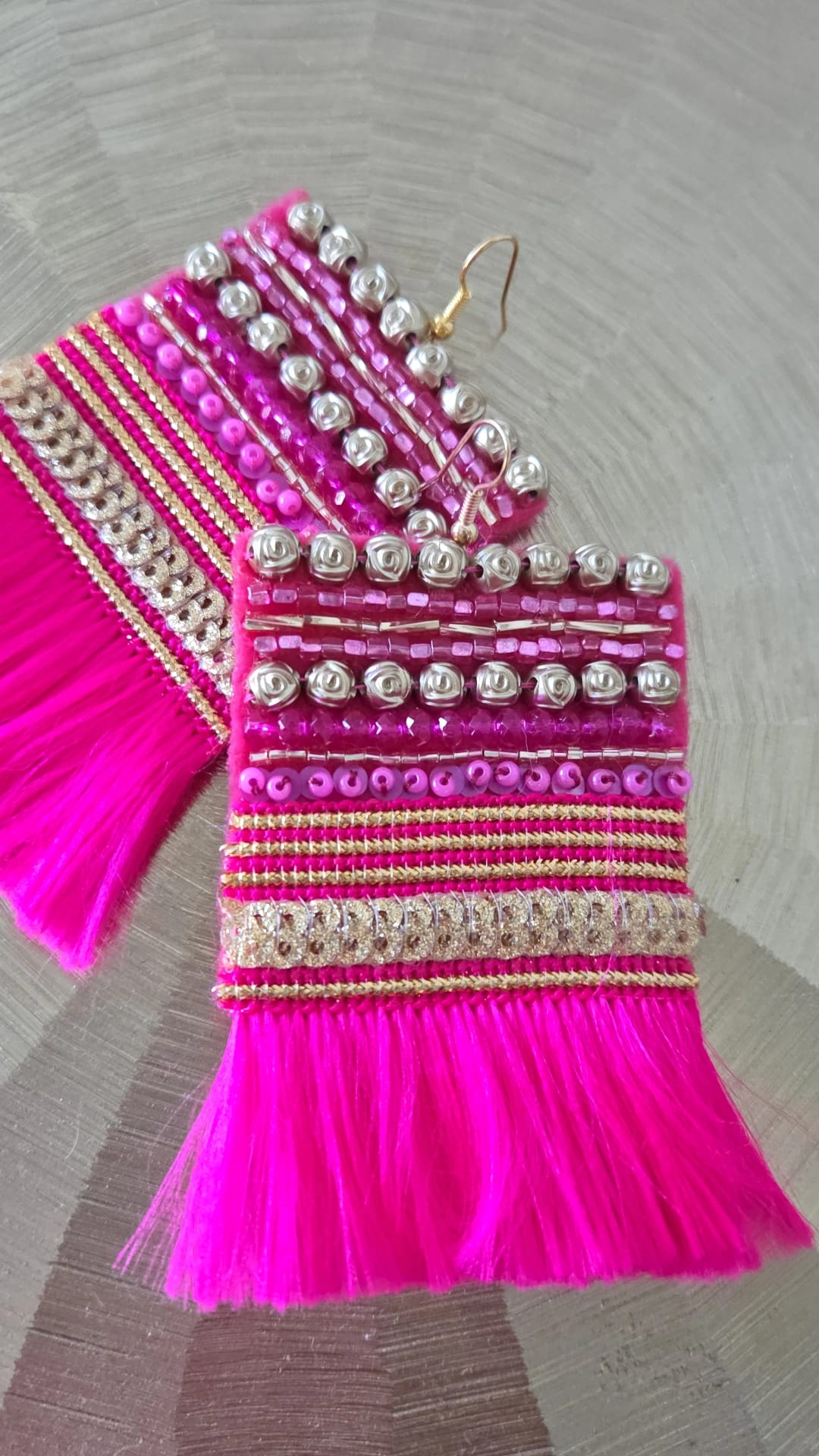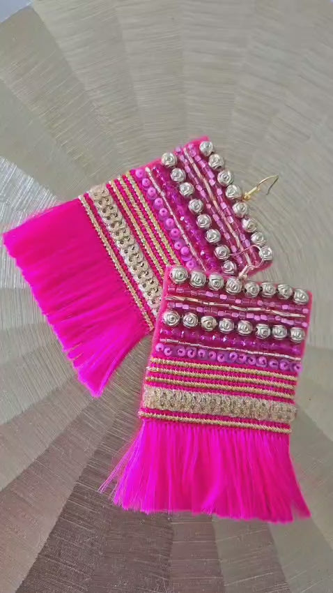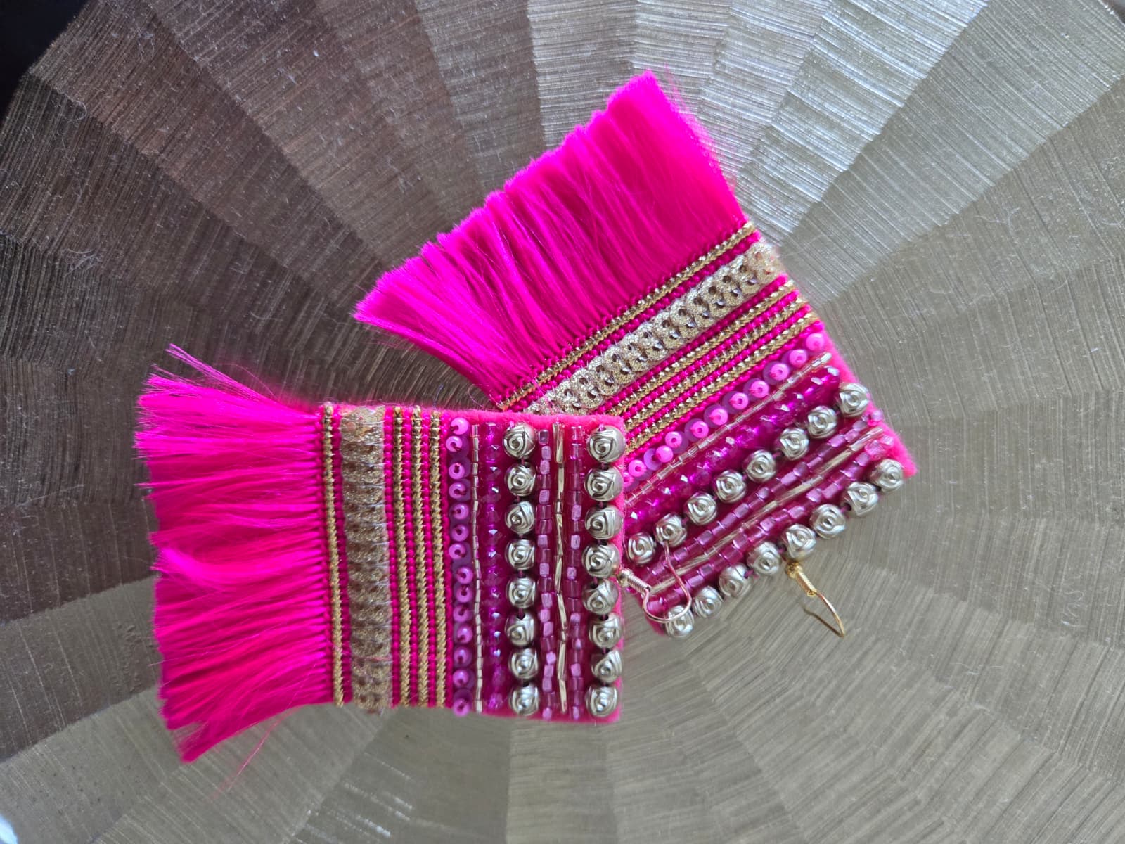 *add a bold pop of color to your look with these stunning hand-embroidered tassel earrings. Designed in a rich magenta hue with golden accents .they strike the perfect balance between playful and elegant.