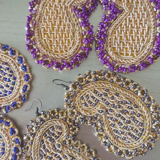 Discover the elegance of traditional Persian craftsmanship with these exquisite earrings. Hand-embroidered with fine golden threads and adorned with stunning dark gray beads, these earrings reflect the beauty of ancient Persian art. Each pair is meticulously crafted to bring a touch of timeless elegance to your style .