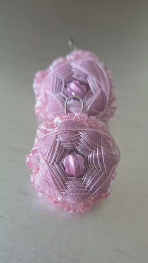 These exquisite earrings are meticulously crafted to resemble a blooming rose. Unlike the previous designs, these do not feature a ribbon in the same blue tones. Instead, multiple layers of ribbon are intricately folded to form a beautiful rose shape. The center of the flower features a lovely shade of violet, and the outer circle is adorned with broken beads and delicate purple sequins, adding a touch of sparkle and elegance.